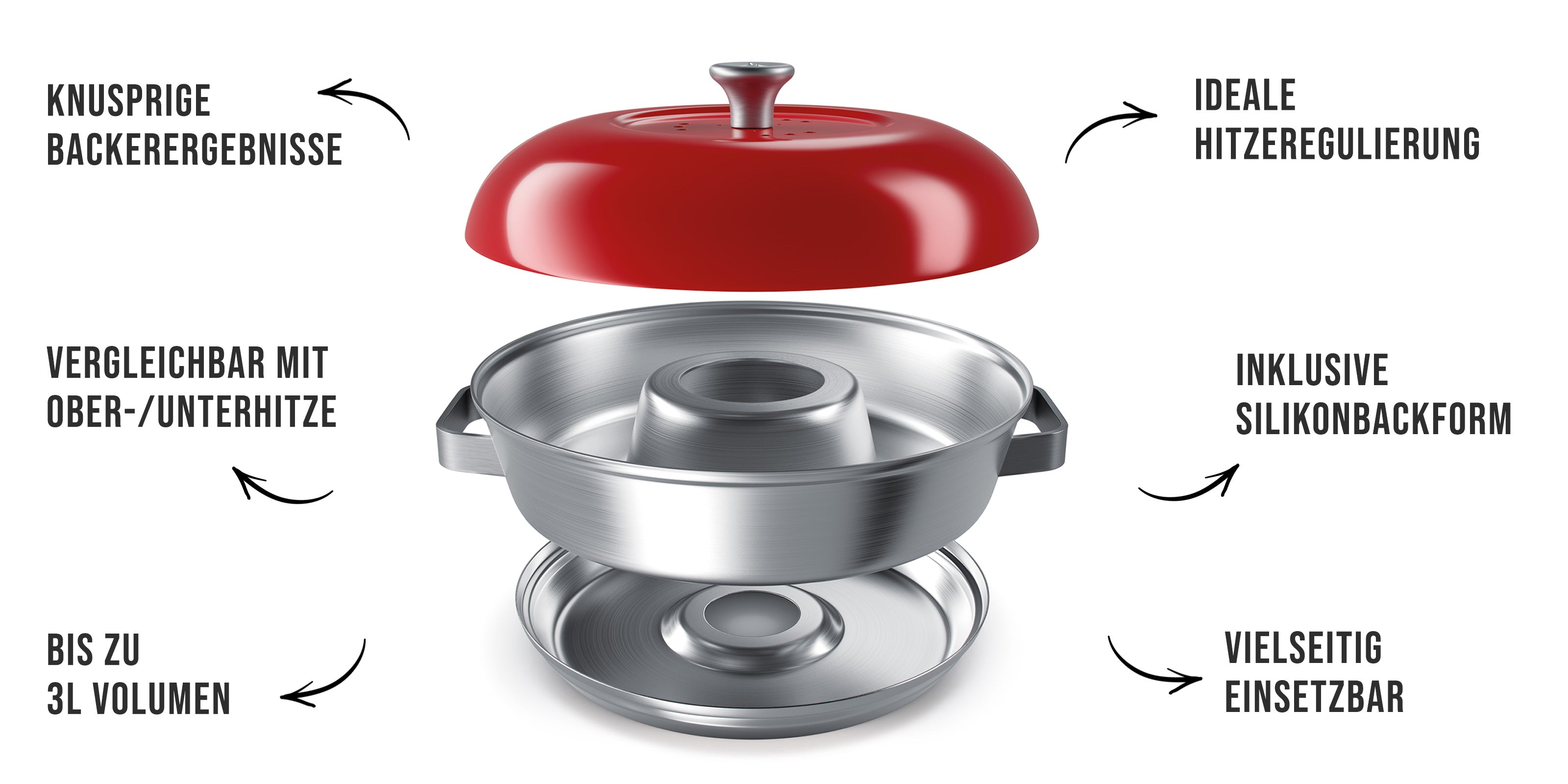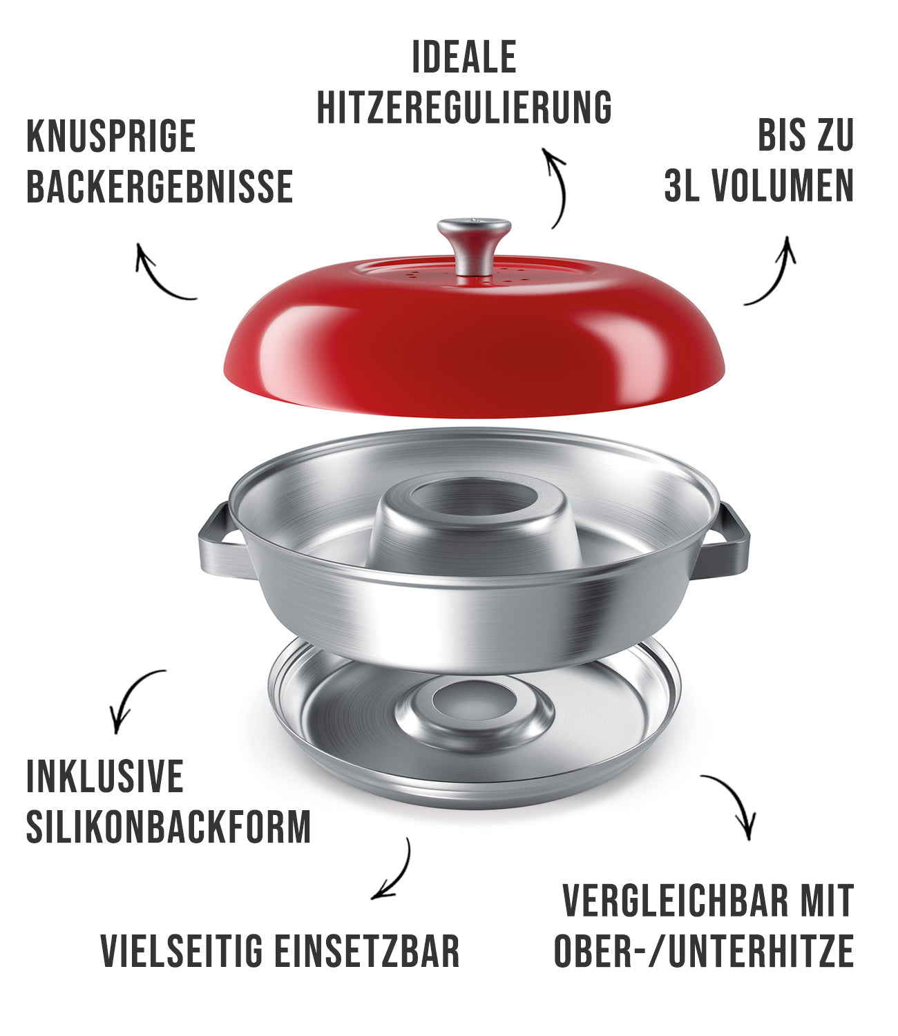 Durch den 3-teiligen Aufbau des Camping Backofens, erhältst du einen Effekt, welcher der Ober- & Unterhitze deines Backofens gleicht. Dank der Hitzeregulierung im Deckel, kannst die Wärme optimal an jedes Gericht anpassen.