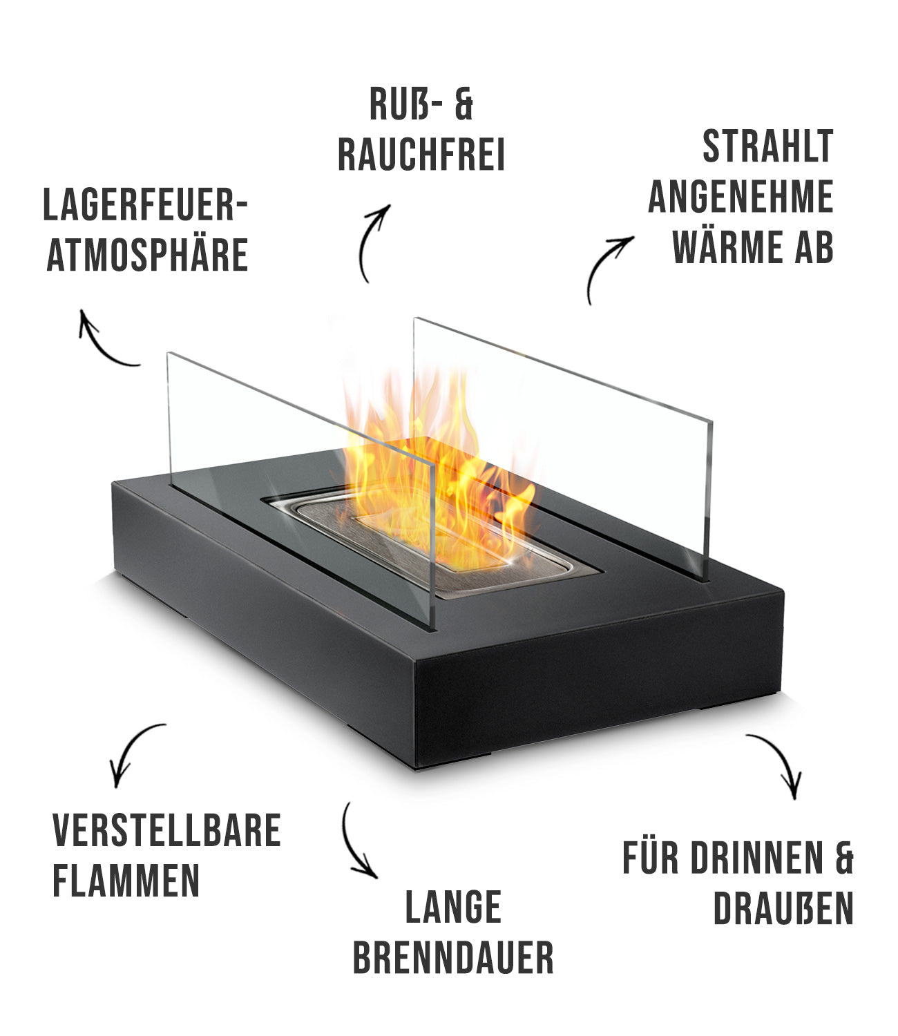 Der Tischkamin ist ein spektakulärer Blickfang, der sauber brennt und langanhaltende Wärme zu allen Seiten abstrahlt. Und das sogar absolut geruchlos und rußfrei.