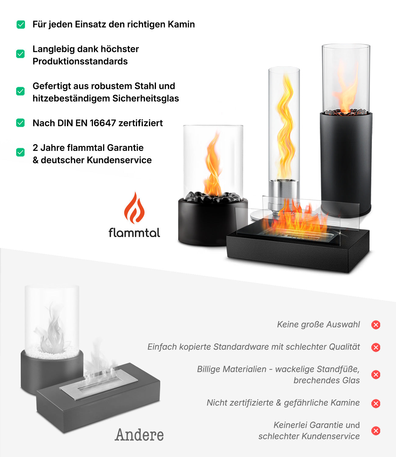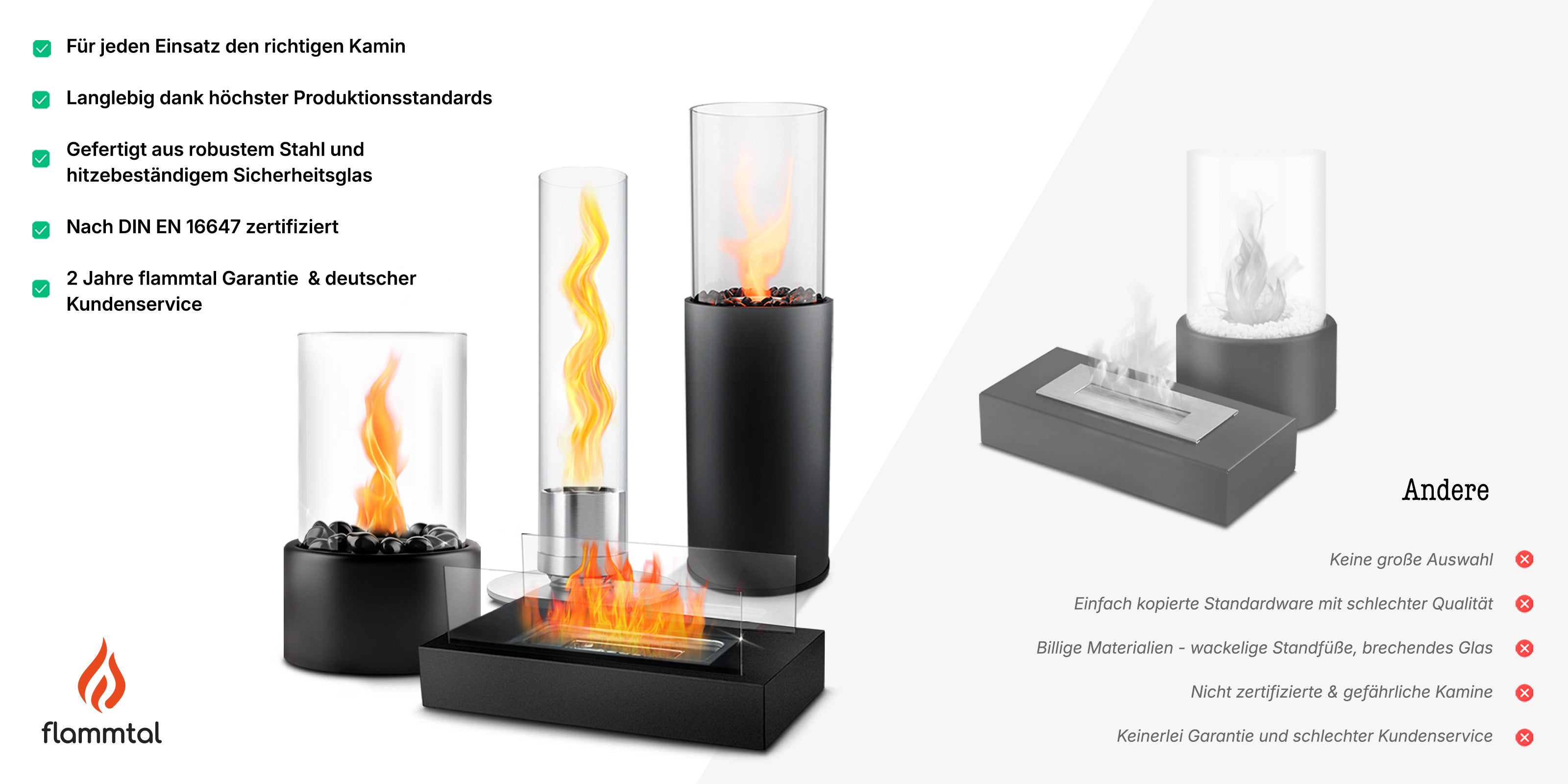 Die Kamine bestehen aus hochwertigem Metall, rostfreiem Edelstahl und feuerfestem Borosilikatglas. Somit sind die Kamine nicht nur optisch ein Hingucker, sondern halten auch eine Ewigkeit!