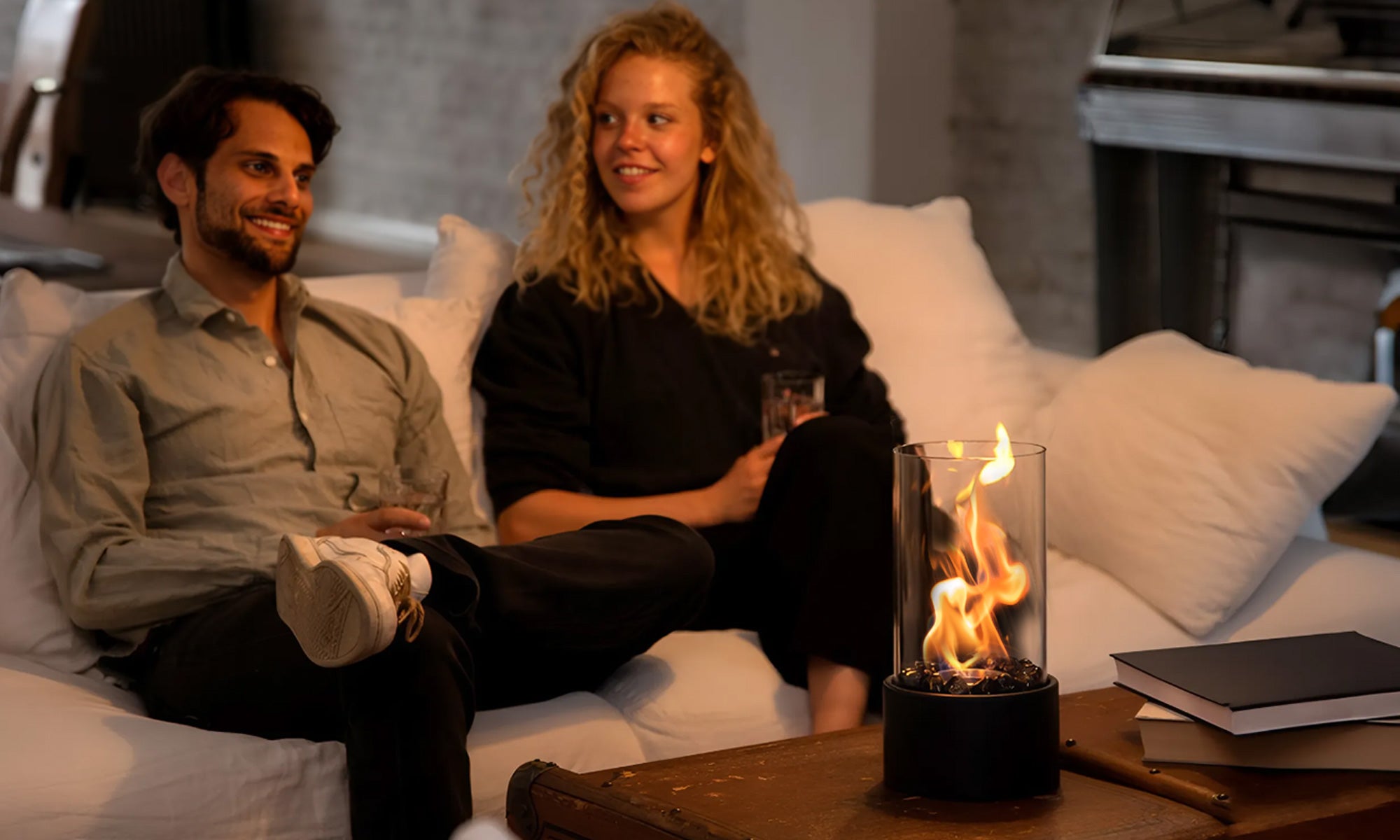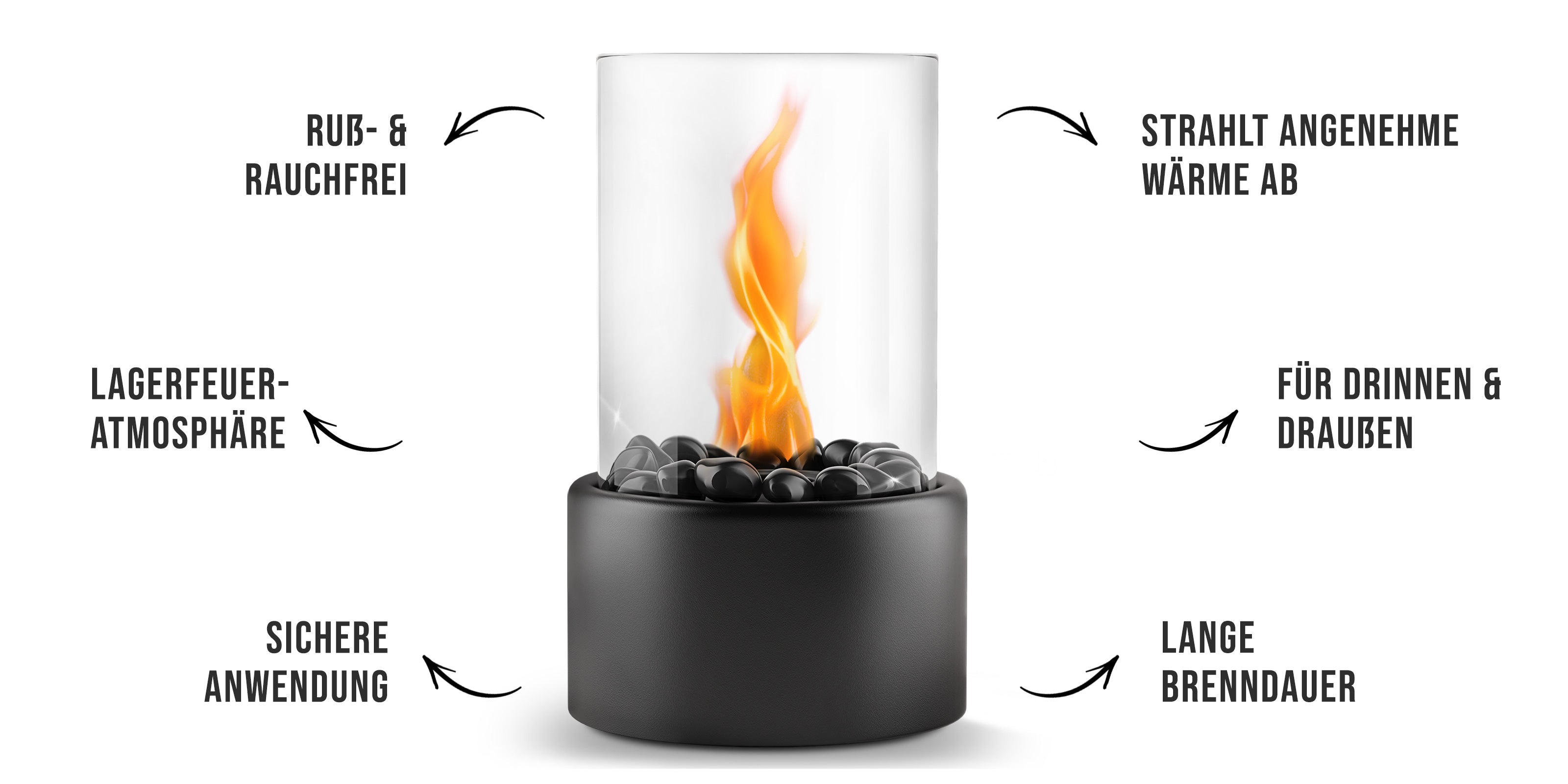 Der Tischkamin ist ein spektakulärer Blickfang, der sauber brennt und langanhaltende Wärme zu allen Seiten abstrahlt. Und das sogar absolut geruchlos und rußfrei.